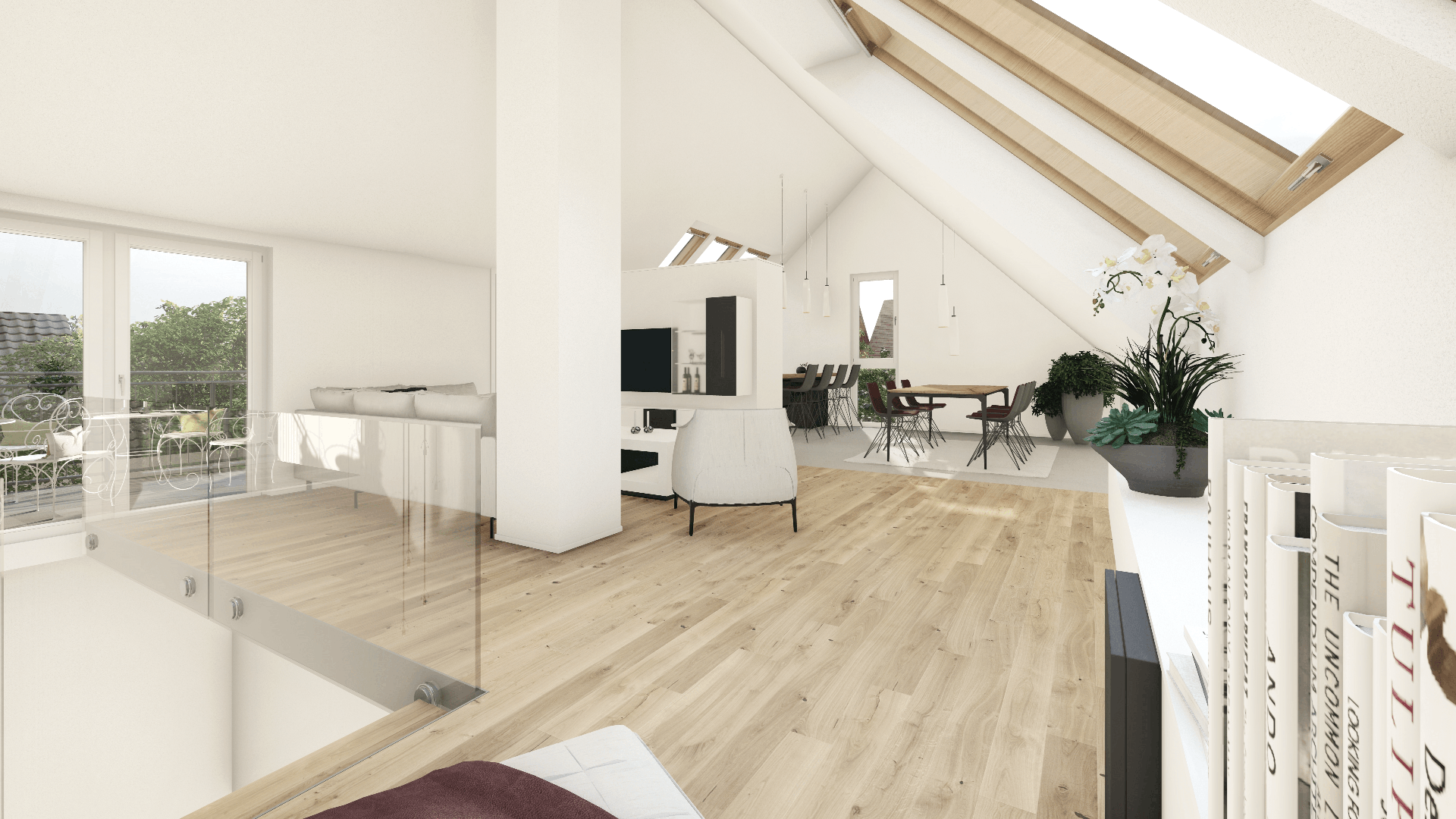 wo sich der offene Wohnbereich mit Loftcharakter befindet. Die großzügige Wohnfläche bietet ausreichend Platz für gemütliche Wohn- und Essbereiche. Die bodentiefen Fenster sorgen für eine helle und freundliche Atmosphäre. Zudem befindet sich auf dieser Etage die voll ausge- stattete Küche.